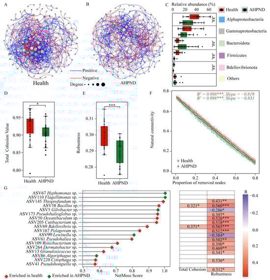 Comparison of networks and their properties between healthy and AHPND-infected shrimp after removing the dph-discriminatory taxa. Co-occurrence networks for (A) healthy and (B) AHPND-infected shrimp. Comparison of (C) relative abundances of the network nodes that are categorized into bacterial phylum level, (D) network total cohesion, (E) robustness, and (F) connectivity (invulnerability) between healthy and AHPND cohorts using Wilcoxon rank-sum test. ***: p < 0.001; **: p < 0.01 and *: p < 0.05. (G) Keystone nodes that trigger shifts in the network from health to AHPND status, and the associations between their relative abundance and network characteristics using the Spearman correlation.