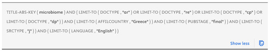 After various combinations of keywords and search operators, the word “microbiome” was selected in English to include and compare the annual production of records up to and including the end of 2024. The search was performed in the fields “Article title, Abstract, Keywords” by selecting the corresponding option from the Scopus search filter options menu. The country “Greece” was also selected, which resulted in the retrieval of documents from Greece and Greek researchers publishing in collaboration with universities abroad. In addition, the types of chosen documents were scientific articles, literature review articles, and articles from conference proceedings, “articles-conference paper-review”, and the language “English” (Figure 2).