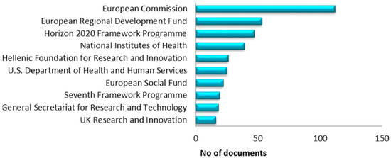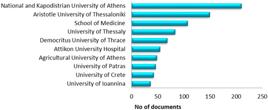 Figure 6 and Figure 7 illustrate the sources of funding for research related to the microbiome and the top ten universities in terms of article production. The European Union, with various funding mechanisms and schemes, dominates the field of research funding, and the Greek research community often turns to European funding sources (253 manuscripts in total). The first Greek institution, the National Institutes of Health, ranked fourth (39 manuscripts). In contrast, two additional institutions emerged from Greece, which were listed in sixth and ninth positions: the Hellenic Foundation for Research and Innovation (26 manuscripts) and the General Secretariat for Research and Technology (18 manuscripts).