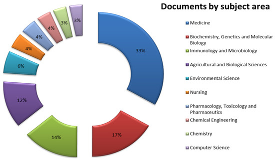 Figure 8 presents the percentage distribution of articles in this research according to the subject area, showing the ten regions that hosted the most documents. The scientific areas that appear to be most related to the microbiome include, among others, medicine (33%), biochemistry, genetics, and molecular biology (17%), and immunology and microbiology (14%), indicating an intense research focus on medical and genetic sciences as well as in infectious diseases and microbial research. In addition, agricultural and biological sciences (12%) and environmental science (6%) focus on food and crop sciences, climate change, ecosystems, and sustainability. Lastly, the scientific areas and disciplines of nursing, pharmacology, toxicology, and chemical engineering appear to be related to microbiome research and innovations, with their percentages below 5%.