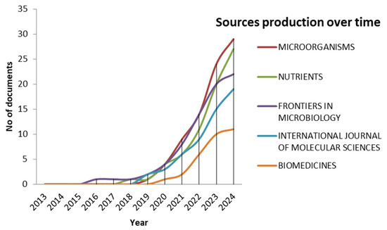 Figure 9 represents the cumulative increase in publications from the top five scientific journals regarding microbiome research from 2013 to 2024. Each line represents a different journal, illustrating the cumulative number of publications annually.