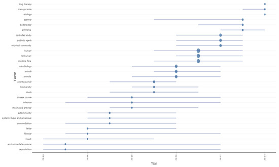 The horizontal axis shows the temporal aspect, while the vertical axis shows the keywords. “Microbial community, intestine flora, probiotics, bacteria, microbiology” are terms related to studying the microbial community, the intestinal flora, and their relationship with health. Their increasing presence in recent decades reflects the growing interest in the role of the microbiome in human physiology and pathology.