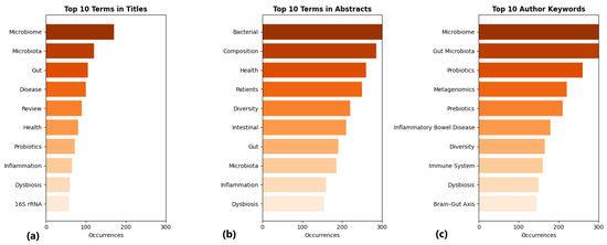 Overall, the term “microbiome” is the most dominant in two of the three fields. The Titles focus on general topics such as reviews and their relationship with disease. The Abstracts include more terms related to the composition, diversity, and impact on human health. The keywords centered on the genetic analysis of the microbiome and the use of probiotics and prebiotics in the study of the gut microbiome.