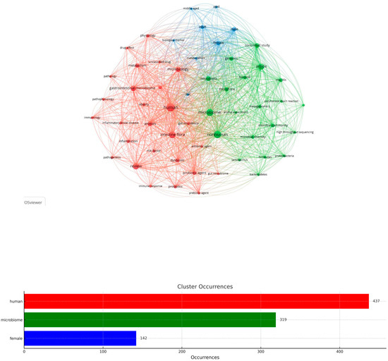 The red cluster includes keywords related to the human microbiome, metabolic disorders, pathogenesis, and immune responses. The main thematic sections of the red group include the human microbiome and intestinal flora (“human, intestine flora, gut microbiota, gut microbiome, gastrointestinal microbiome, microbiology”), with a focus on the function and structure of the microbiome and its multifactorial role in the human intestine. Also, through terms such as “inflammation, inflammatory bowel disease (IBD), immune response, immunology, pathogenesis, pathology, pathophysiology, and risk factor”, the red cluster includes research on the relationship of the microbiome with chronic inflammatory diseases such as IBD, and various immune responses. In addition, this cluster highlights the metabolic processes and the dysbiosis (“metabolism, dysbiosis, obesity, probiotic agent, probiotics, prebiotic agent”), namely the study of the disruption of the composition of the microbial flora and its association with metabolic diseases such as obesity. The analysis of the effects of drugs and therapeutic approaches such as antibiotics on the evolution and formation of the intestinal microbial flora is highlighted by the terms “antibiotic agent, drug effect, and unclassified drug”.