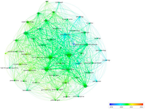 The early phase of research between 2018 and 2019, shown in blue, included terms such as “human”, “microbiota”, “intestinal flora”, “bacteria”, and “microbiology”, which shows that the research was trying to decipher the microbiome through fundamental biological principles and descriptions of the microbial flora. Subsequently and until 2022, terms such as “immune response”, “probiotics”, “dysbiosis”, “gut microbiota”, and “inflammatory bowel disease” are identified, indicating a shift in the Greek academic community towards connecting research on the microbiome with the gastrointestinal system and its role in specific intestinal diseases.