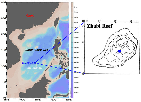 Location and bathymetric map of the Zhubi Reef. Blue dots indicate the specific sampling sites. Sampling site maps were generated using Ocean Data View version 5.6.3 (http://odv.awi.de, accessed on 15 October 2022). The bathymetric map was sourced from the South China Sea Ocean Data Center.