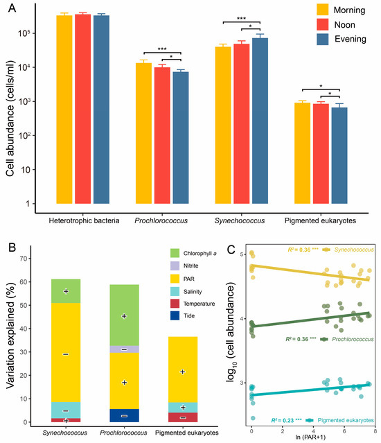 According to stepwise regression models, PAR intensity was identified as the most significant factor influencing the diurnal variations in picophytoplankton cell abundances (Figure 2B and Table S2). It explained 26.7%, 49.2%, and 26.3% of the variations in the cell abundances of Prochlorococcus, Synechococcus, and pico-sized pigmented eukaryotes, respectively. Notably, PAR intensity showed a negative correlation with cell abundances of Synechococcus, while the other two types of picophytoplankton displayed positive correlations (Figure 2C). Additionally, chlorophyll a exhibited a significant positive correlation with the cell abundance of Synechococcus and Prochlorococcus (Figure 2B and Table S2).