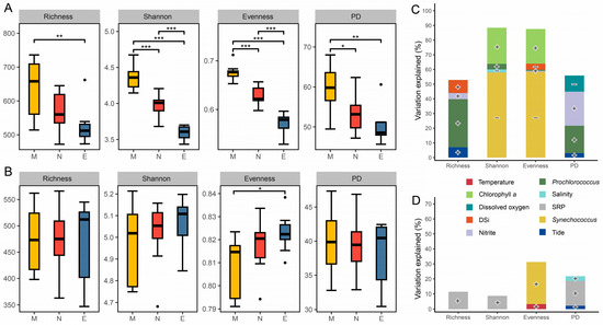 Alpha diversity of microbial communities and environmental factors explaining its variations. Boxplots illustrate the comparison of alpha diversity indices for prokaryotic (A) and microeukaryotic (B) communities among times. Relative contributions of environmental and biotic variables in explaining the variations in alpha diversity indices of prokaryotic (C) and microeukaryotic (D) communities based on stepwise regression models. M, morning; N, noon; E, evening; DSi, dissolved silicate; SRP, soluble reactive phosphate. *, p < 0.05; **, p < 0.01; ***, p < 0.001 (Wilcoxon rank sum test). “•” Indicates greater than 1.5 times of the interquartile range. Positive correlations are denoted by “+”, and negative correlations by “−”.