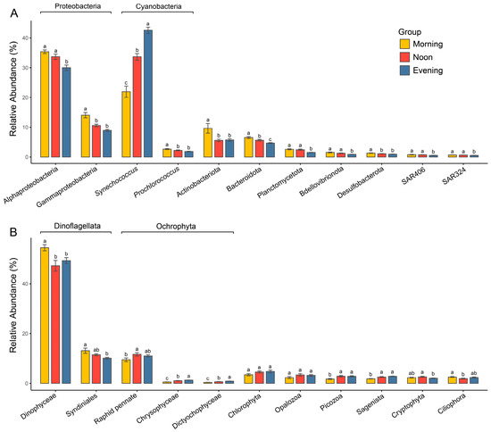 The microeukaryotic community was overwhelmingly dominated by Dinoflagellata, which accounted for about 62% of the total relative abundance (Figure 4B and Figure S5B). This was followed by Ochrophyta at 13.8% and Chlorophyta at 4.3%. Other groups, such as Opalozoa, Picozoa, Sagenista, Cryptophyta, and Ciliophora, constituted only a minor proportion of the microeukaryotic community. The relative abundance of different microeukaryotic taxa exhibited inconsistent variation trends among different times (Figure 4B). Dinoflagellata exhibited significantly higher relative abundance in the morning compared to the evening, while the primary group of Ochrophyta, Raphid pennate, showed a significantly lower relative abundance in the morning than at noon, with no significant difference between morning and evening. Additionally, the relative abundance of Chlorophyta did not differ significantly across timepoints.