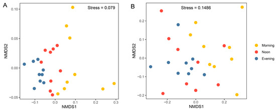 Results from the nMDS analysis based on Bray–Curtis distances showed significant separation of prokaryotic community samples among different times (Figure 5A; R = 0.53, p < 0.001, ANOSIM test; Table 1), suggesting that significant diurnal variations occurred in the prokaryotic community. Even when considering samples from each depth separately, the influence of temporal variation remains evident (1 m: R = 0.53, p < 0.01; 10 m: R = 0.32, p < 0.05; 20 m: R = 0.51, p < 0.01; Table 1). For the microeukaryotic community, the NMDS results show a clear separation between the morning and evening samples (Figure 5B; R = 0.21, p < 0.001; Table 1). When considering each depth separately, the influence of temporal variation is only significant at 1 m (R = 0.41, p < 0.05; Table 1). Dendrograms generated by the unweighted pair group method with arithmetic mean (UPGMA) clustering exhibited a consistent pattern (Figure S5).