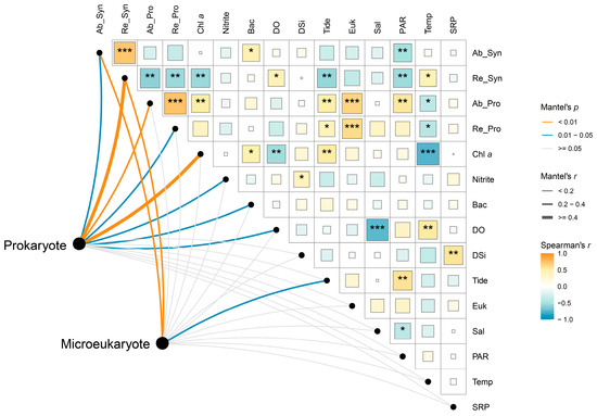 Spearman correlations and Mantel test reveal environmental–microbial relationships. The lines connecting environmental variables and microbial communities represent the strength of their relationship. A larger line indicates a stronger relationship. The color of the blocks and the asterisks reflects the relationships between environmental variables. Ab_Syn, cell abundance of Synechococcus; Re_Syn, relative abundance of Synechococcus; Ab_Pro, cell abundance of Prochlorococcus; Re_Pro, relative abundance of Prochlorococcus; Chl a, chlorophyll a concentration; Bac, cell abundance of heterotrophic bacteria; DO, dissolved oxygen; Tide, tidal height; Euk, cell abundance of pico-sized pigmented eukaryotes; Sal, salinity; Temp, temperature. *, p < 0.05; **, p < 0.01; ***, p < 0.001.
