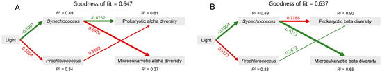 The partial least squares path model (PLS-PM) showing the direct and indirect effects of light, Synechococcus, and Prochlorococcus on the alpha diversity (A) and beta diversity (B) of prokaryotic and microeukaryotic communities. The width of the arrow is proportional to the strength of the path coefficient. The red and green arrows indicate the positive and negative flow of causality, respectively (p < 0.05). The number on the arrow indicates the effective normalized path coefficient. R2 represents the variance of the dependent variable explained by the model. Synechococcus, the absolute and relative abundance of Synechococcus; Prochlorococcus, the absolute and relative abundance of Prochlorococcus.