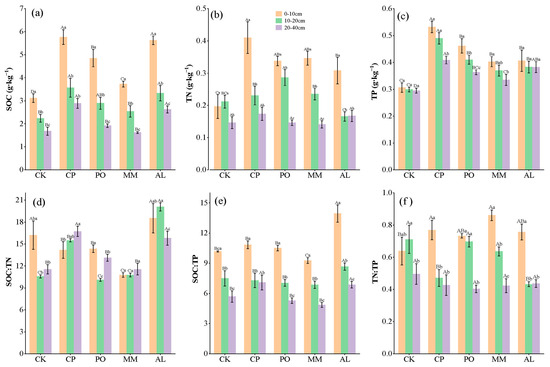 Figure 1. Soil C, N, and P contents and their stoichiometric ratios. (a) SOC, soil organic carbon; (b) TN, total nitrogen; (c) TP, total phosphorus; (d) SOC:TN, ratio of SOC to TN; (e) SOC:TP, ratio of SOC to TP; (f) TN:TP, ratio of TN to TP. Different lowercase letters indicate significant differences between different soil layers of the same treatment (p < 0.05) and different uppercase letters indicate significant differences between different treatments of the same soil layer (p < 0.05).