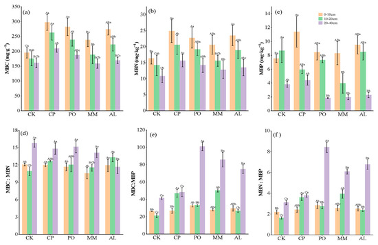 Figure 2. Soil microbial biomass C, N, and P content and their stoichiometric ratios. (a) MBC, microbial biomass carbon; (b) MBN, microbial biomass nitrogen; (c) MBP, microbial biomass phosphorus; (d) MBC:MBN, ratio of MBC to MBN; (e) MBC:MBP, ratio of MBC to MBP; (f) MBN:MBP, ratio of MBN to MBP. Different lowercase letters indicate significant differences between different soil layers of the same treatment (p < 0.05) and different uppercase letters indicate significant differences between different treatments of the same soil layer (p < 0.05).