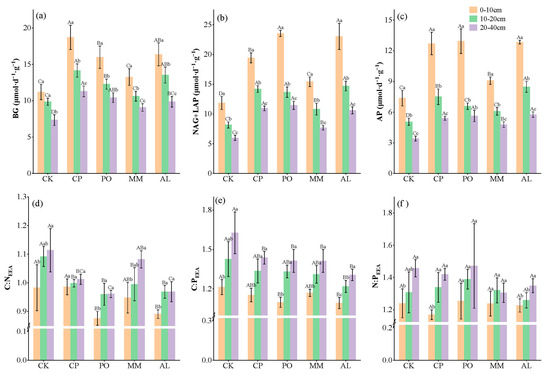Figure 3. Soil C, N, P acquisition enzyme activities and stoichiometric ratios. (a) BG, C acquisition enzyme; (b) NAG + LAP, N acquisition enzyme; (c) AP, P acquisition enzyme; (d) C:NEEA, ratio of log-transformed activity of BG to that of NAG + LAP; (e) C:PEEA, ratio of log-transformed activity of BG to that of AP; (f) N:PEEA, ratio of log-transformed activity of NAG + LAP to that of AP. Different lowercase letters indicate significant differences between different soil layers of the same treatment (p < 0.05) and different uppercase letters indicate significant differences between different treatments of the same soil layer (p < 0.05).
