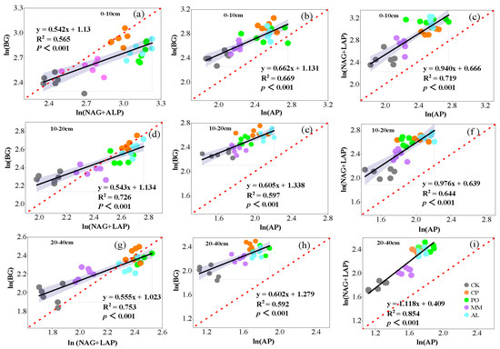 Figure 4. Linear regression analysis between soil extracellular enzyme stoichiometry of C, N, and P. (a,d,g) ratio of log-transformed activity of NAG + LAP to BG for 0–10 cm, 10–20 cm, and 20–40 cm, respectively; (b,e,h) ratio of log-transformed activity of AP to BG for 0–10 cm, 10–20 cm, and 20–40 cm, respectively; (c,f,i) ratio of log-transformed activity of AP to NAG + LAP for 0–10 cm, 10–20 cm, and 20–40 cm, respectively.