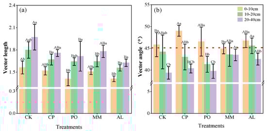 Figure 5. Vector lengths and angles. (a) vector length; (b) vector angle. Different lowercase letters indicate significant differences between different soil layers of the same treatment (p < 0.05) and different uppercase letters indicate significant differences between different treatments of the same soil layer (p < 0.05).