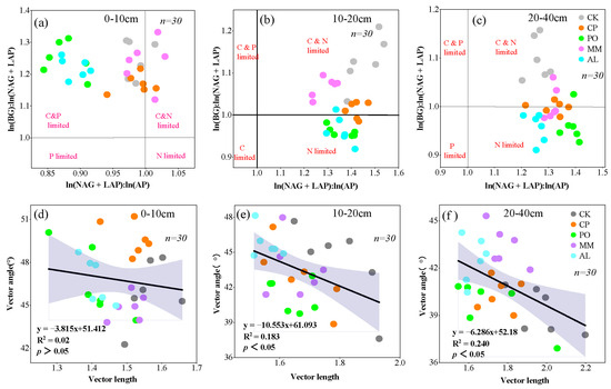 Figure 6. Scatterplot of soil enzyme stoichiometry limits and the relationship between vector length and vector angle. (ac) Scatter plots of enzyme stoichiometric limits for 0–10 cm, 10–20 cm, and 20–40 cm, respectively; (df) relationship between vector length and vector angle for 0–10 cm, 10–20 cm and 20–40 cm, respectively. The figure n = 30 refers to a total of 5 treatments in each subplot, with 6 replicates per treatment, for a total of 30 data.