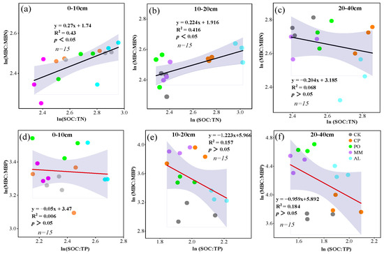 Figure 7. Soil microbial community homeostasis. (ac) Steady state between ln(SOC:TN) and ln(MBC:MBN) for 0–10 cm, 10–20 cm, and 20–40 cm, respectively; (df) steady state between ln(SOC:TP) and ln(MBC:MBP) for 0–10 cm, 10–20 cm, and 20–40 cm, respectively. The figure n = 15 refers to a total of 5 treatments with 3 replications per treatment for a total of 15 data in each subplot.