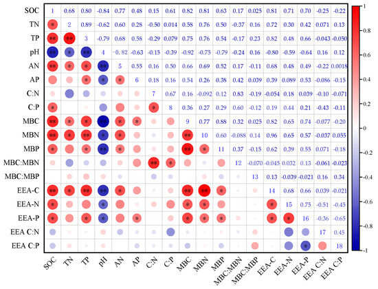 Figure 8. Pearson correlation analysis of soil properties and enzyme activities and stoichiometric ratios. SOC, soil organic carbon; TN, total nitrogen; TP, total phosphorus; AN, alkaline hydrolyzed nitrogen; AP, available phosphorus; C:N, soil carbon to nitrogen ratio; C:P, soil carbon to phosphorus ratio; MBC, microbial biomass carbon; MBN, microbial biomass nitrogen; MBP, microbial biomass phosphorus; MBC:MBN, ratio of MBC to MBN; MBC:MBP, ratio of MBC to MBP; MBN:MBP, ratio of MBN to MBP; EEA-C: carbon acquisition enzyme, EEA-N: nitrogen acquisition enzyme, EEA-P: phosphorus acquisition enzyme, EEA C:N: enzyme carbon to nitrogen ratio, EEA C:P: enzyme carbon to phosphorus ratio (* p < 0.05, ** p < 0.01).