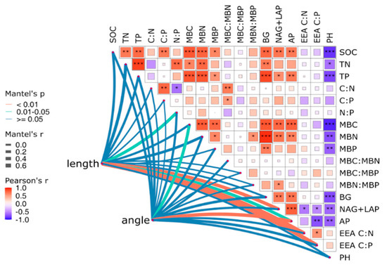 Figure 9. Spearman correlation between vector length and angle and soil chemical properties and microbial properties. The thickness of the line indicates the strength of the correlation, and the asterisk indicates statistical significance (* p < 0.05, ** p < 0.01, *** p < 0.001). Length: vector length, angle: vector angle.