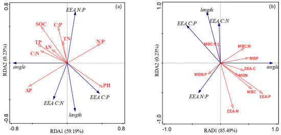 Figure 10. RDA analysis of soil chemical properties and microbial properties on enzyme stoichiometry and microbial nutrient limitations. (a) Relationship of chemical properties to enzyme stoichiometric ratios and microbial nutrient limitation; (b) relationship of microbial properties to enzyme stoichiometric ratios and microbial nutrient limitation.