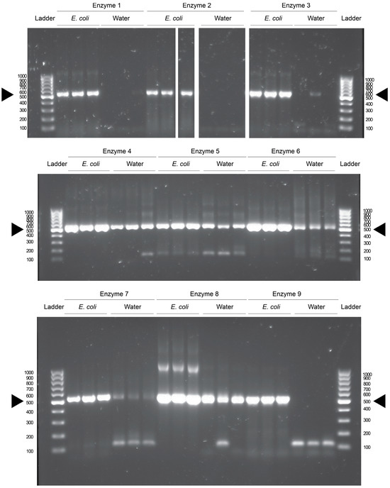 The detection of contaminating bacterial DNA in PCR enzymes. A broad sampling of PCR enzymes reveals that many are contaminated with bacterial DNA. Representative gel images of nine PCR enzymes from 6 manufacturers reveal that for 7 of these enzymes, all except enzymes 2 and 9, there is contaminating DNA, resulting in the production of DNA product of the target size. Primers targeted the V3-4 region of the bacterial 16S rRNA gene. As shown in E. coli DNA control reactions, this product comprises approximately 500 bases, indicated by black arrows. DNA contamination is unlikely to have been introduced in our lab, as not every reaction is contaminated, and contamination is consistent across technical replicates. The ladder is the molecular size maker, labeled as the number of bases per band. E. coli labeled reactions contain E. coli DNA; water reactions contain no exogenous DNA. Images are from a single representative experiment with three technical replicates per reaction. Each lane is a single technical replicate of the indicated condition.