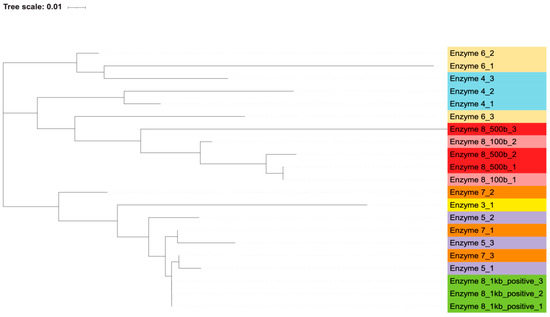 By generating phylogenetic trees using the maximum likelihood algorithm, we found that there was an association between the polymerase used and the resulting sequence of the contaminating bands. Most of the polymerases closely associated with themselves (Figure 2 and Figure 3). The exception to this is enzyme 7, which is interspersed with enzymes 3 and 5. Percent identity between sequences, as calculated by the Clustal algorithm, can be found in Table 8. These calculations indicate that while certain enzymes and reactions have highly similar sequences (enzyme 8’s positive reactions), the sequencing results are highly diverse across the different enzymes. The most likely contaminating bacteria based on sequence identity were determined through the use of the NCBI blast algorithm. The likely identities of these bacteria can be found in Supplementary Table S2.