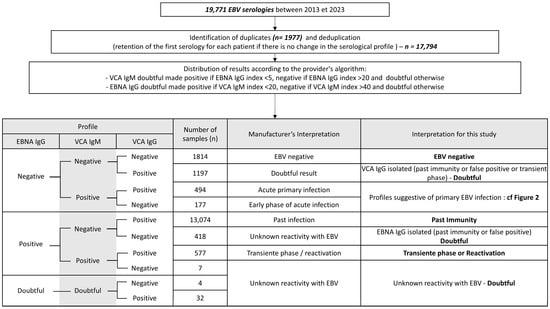 All outpatients and inpatients admitted to the Amiens University Hospital between January 2013 and December 2023 who underwent EBV serology were included. EBV serology was most commonly requested in the following clinical contexts: (i) diagnosis of infectious mononucleosis, (ii) evaluation of immunocompromised patients, or (iii) suspicion of EBV-associated pathology. EBV detection has been incorporated into several protocols for the management of immunocompromised, hematological, and oncological patients [20,21]. Inclusion criteria included all patients, regardless of pathology or prescribing clinical department. The only exclusion criteria were based on deduplication; if a patient had a previous EBV serology, only the first test result was retained unless seroconversion occurred, in which case both the first seronegative and the first seropositive results were retained. Demographic data, such as age and sex, were obtained from the medical records, as well as the date of serological testing.