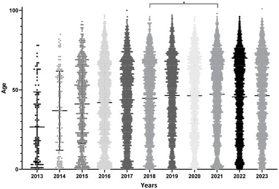 Age of screened patients by year of screening. ANOVA revealed significant differences (p-value < 0.0001); subsequent pairwise comparisons from 2013 to 2018 showed a progressive increase in the age of patients screened (significant differences with Tukey’s test). On the contrary, from 2018 onwards, no differences were found between any pair of years, except for 2018 vs. 2021 (* = p-value < 0.05).