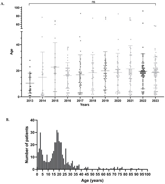 (A) Scatterplot of age of patients with primary EBV infection by year of serological testing. ANOVA shows no significant change in mean age over time (p > 0.05, ns = non-significant). (B) Mean age distribution of primary infections from 2013 to 2023.