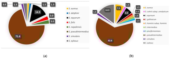 Representation of Staphylococcus species isolated from the skin of shelter dogs according to MALDI TOF (a) and STAPHY 24 test (b).