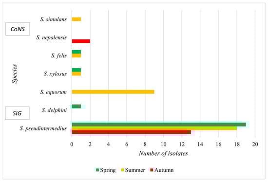 Representation of SIG (S. delphini, S. pseudintermedius) and CoNS (S. simulans, S. nepalensis, S. xylosus, S. equorum) in isolates from shelter dog skin by season. Spring = March–May, summer = June–August, autumn = September–November.