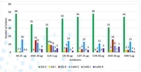 The highest sensitivity was observed for AK, with 96% of SIG isolates and 100% of CoNS isolates being susceptible. High sensitivity was also noted for CVN in SIG isolates (96%) and CN in CoNS isolates (87.5%). The highest proportion of intermediate isolates was recorded for CLN, with 20% in SIG and 18.75% in CoNS. Regarding resistance, the highest percentage of resistant SIG isolates was observed for DOX (32%) and AMC (30%). In CoNS isolates, the highest resistance was recorded for DOX (43.75%), followed by CVN and CLN (31.25% each) (Figure 3).