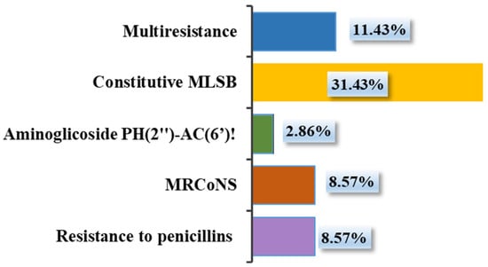 According to the resistance profile, resistance mechanisms were also automatically evaluated. Constitutive MLSB (macrolide/lincosamide/streptogramin B) was the most common (31.43%), but multi-resistant CoNS strains (11.43%) were also present, which represent the highest risk for pet owners. The MRCoNS mechanism (methicillin-resistant CoNS) was recorded in 8.57% of isolates, with all beta-lactams being ineffective. Penicillinase resistance also represented 8.57%. In 2.86% of isolates, a resistance mechanism to aminoglycosides (PH(2″)-AC(6′)!) was found, which represents complications in treatment with these antibiotics and combined enzymatic resistance to gentamicin, tobramycin, and ampicillin (Figure 4).
