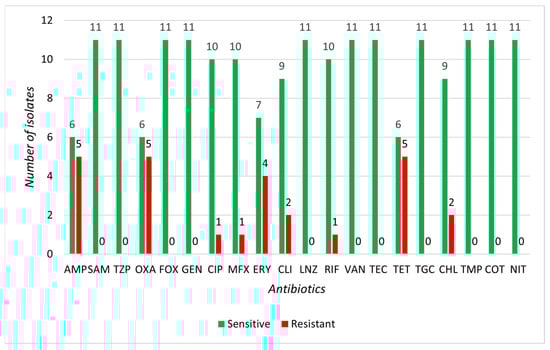 Representation of sensitive and resistant strains of 11 selected CoNS isolates to individual antibiotics.