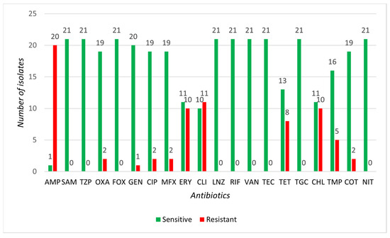 For isolates that exhibited qualitative resistance, antibiotic susceptibility was further assessed quantitatively using the minimum inhibitory concentration (MIC) test for higher precision. MIC values were determined by a colorimetric microdilution method with automated reading via the Miditech system (Bratislava, Slovakia) [43]. The antibiotics tested in the MIC assay included ampicillin (AMP), ampicillin + sulbactam (SAM), piperacillin + tazobactam (TZP), oxacillin (OXA), cefoxitin (FOX), gentamicin (GEN), ciprofloxacin (CIP), moxifloxacin (MFX), erythromycin (ERY), clindamycin (CLI), linezolid (LNZ), rifampicin (RIF), vancomycin (VAN), teicoplanin (TEC), tetracycline (TET), tigecycline (TGC), chloramphenicol (CHL), trimethoprim (TMP), trimethoprim + sulfonamide (COT), and nitrofurantoin (NIT). The Miditech software (Bel-MIDITECH s.r.o., Bratislava, Slovakia; cat. n. 002002) also predicted resistance mechanisms and resistance percentages for each antibiotic. Based on MIC breakpoints following the guidelines of EUCAST 2024 (version 14.0) [41], the system classified isolates as susceptible or resistant and co-trimoxazole (COT) as susceptible, intermediate, or resistant.