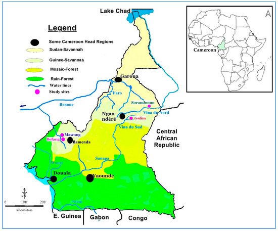 The village of Galim is located on the Adamawa Plateau in a Guinea savannah region 15 km southwest of Ngaoundéré, approximately 3 km from the large river Vina du Sud (mean annual discharge 37 m3/sec, 1050 m altitude) [27]. The Adamawa Plateau is necessary for livestock production in Cameroon, and agriculture is the main economic activity practiced by the inhabitants.