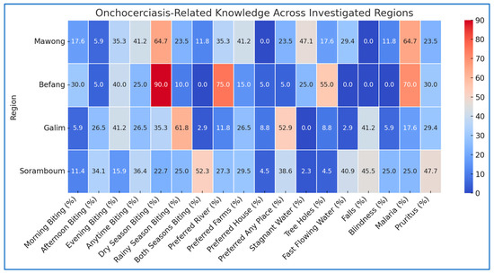Below is a heatmap (Figure 3) consolidating the view of knowledge about onchocerciasis across four investigated regions. The data include responses to key factors related to blackfly behavior, breeding sites, and the effects of fly bites.