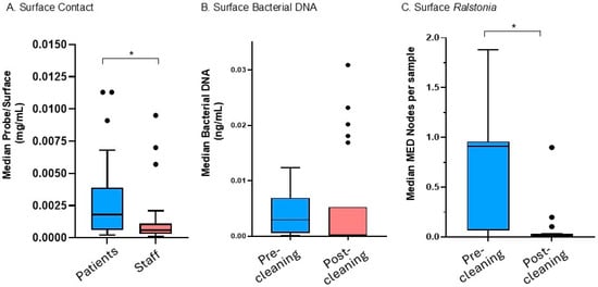 Characterization of surface contact and contamination. (A) Patient and staff contact based on residual fluorescent probe. (B) Bacterial 16S ribosomal gene DNA detected on surfaces, pre- and post-cleaning. (C) Ralstonia genus relative abundance (median MED-nodes) per sample based on sequencing analysis, pre- and post-cleaning. Abbreviations and symbols are as follows: * indicates significant difference between groups; mL, milliliters; ng, nanograms; Post, post-cleaning; Pre, pre-cleaning.
