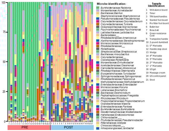 Total bacterial DNA on surfaces was employed as a proxy for estimating contamination on clinic surfaces. Prior to the implementation of the cleaning plan, bacterial abundance on surfaces was greatest on the third mat table, massage cream tube, and TRX cord handles (Table 1). After cleaning, the most contaminated surfaces were the step stool handles, the forth mat table, and the ultrasound gel bottle (Table 1). After implementation of the cleaning and hygiene plan, and comparing only the samples examined both before and after cleaning, there was no significant change in the mean total bacterial load (Figure 2B, Pre = 0.002950, 25th/75th percentiles = 0.000575, 0.006925, N = 22 vs. Post = 0.00030, 25th/75th percentiles = 0.00010, 0.005275, N = 22, p = 0.4680). Neither the degree of patient nor staff contact showed a significant correlation with total bacteria DNA prior to the cleaning intervention (Patient r = 0.0731, N = 21, p = 0.6672, Staff r = 0.007443, N = 22, p = 0.9646). Figure 3 Abundance by genus shown as a histogram of all bacteria for surfaces swiped both pre- and post-cleaning. The key shows the top 45 most abundant taxa resolved as close to the genus as possible, as well as the descriptions of the surfaces sampled. The complete key is shown in the Supplementary Materials, Figure S1. Abbreviations are as follows: Post, post-cleaning; Pre, pre-cleaning; US, ultrasound.
