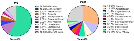 Pie chart showing top 10 genera pre- and post-cleaning. Abbreviations are as follows: Post, post-cleaning; Pre, pre-cleaning.