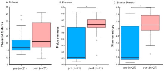 Alpha diversity pre- and post-cleaning based on MED analysis. (A) Richness, (B) Evenness, (C) Shannon Diversity. Abbreviations and symbols are as follows: * indicates significant difference between groups; post, post-cleaning; pre, pre-cleaning.