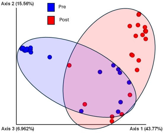 Beta diversity pre- and post-cleaning. The 3rd dimension is coming out of the paper and is not visible. Abbreviations are as follows: Post, post-cleaning; Pre, pre-cleaning.