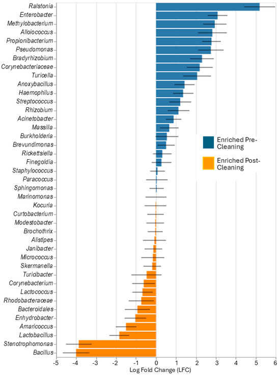 Differential abundance of microbiota based on genus comparing pre- and post-cleaning.