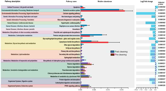 Functional metabolic gene profiles, pre- and post-cleaning, were predicted utilizing Phylogenetic Investigation of Communities by Reconstruction of Unobserved States (PICRUSt2.4.1) [28]. Analysis was performed using R package ggpicrust2 [29] and used to generate Kyoto Encyclopedia of Genes and Genomes release 102.0 (KEGG; https://www.genome.jp/kegg/, last accessed 22 November 2024) orthologs based on OTC counts from the Greengenes database (v.13.8) [30,31,32].