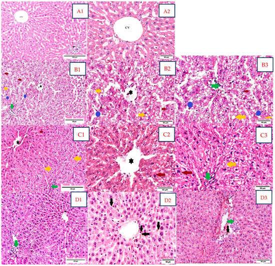 The negative control group (Figure 4(A1,A2)) exhibited a normal distribution of the hepatocyte cords and adjacent sinusoids following the central hepatic vein, displaying a regular architecture within the hepatic lobules.