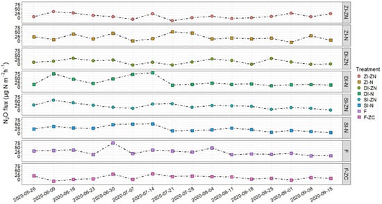 Regarding fertilizer application in ZI-N, SI-N, DI-N, and F, an increase in N2O flux rates by a factor of two to three compared to the untreated reference treatment (ZI-ZN) was found (Supplementary Table S3). The detected N2O fluxes partly exceeded the N2O flux rates and cumulative area-related N2O emissions found in other studies conducted in potato cropping in sandy soils [36,39,51]. However, comparing these values with those found in 2019 on the same experimental site, lower N2O fluxes were detected in this study [28].
