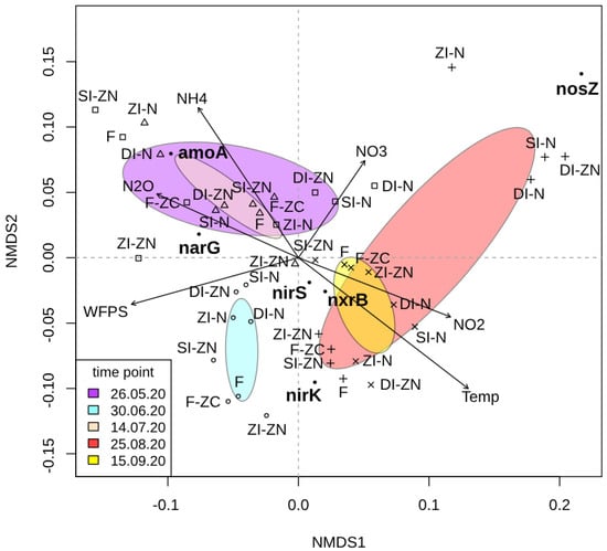 Nonmetric multidimensional scaling (NMDS) analysis based on the detected copy numbers per gram of soil for the investigated genes amoA (encoding ammonium monooxygenase), nxrB (encoding nitrite oxidoreductase), narG (encoding nitrate reductase), nirK/nirS (encoding nitrite reductase), and nosZ (encoding nitrous oxide reductase). Each color symbolizes one of the investigated treatments:ZI-ZN (no (zero) irrigation without (zero) nitrogen (N) fertilizer), ZI-N (no (zero) irrigation with broadcasted nitrogen (N) fertilizer), SI-ZN (sprinkler irrigation without (zero) nitrogen (N) fertilizer), SI-N (sprinkler irrigation with broadcasted nitrogen (N) fertilizer), DI-ZN (drip irrigation without (zero) nitrogen (N) fertilizer), DI-N (drip irrigation with broadcasted nitrogen (N) fertilizer), F (fertigation), lF-ZC (fertigation without (zero) crops). Symbols are used to indicate the different time points (square = 26 May 2020, diamond = 30 June 2020, triangle = 14 July 2020, plus = 25 August 2020, cross = 15 September 2020). The ellipses represent the time points and their respective treatment variants belonging to the different time points, with a 95% certainty (purple = 26 May 2022, light blue = 30 June 2020, bisquel = 14 July 2020, red = 25 August 2020, yellow = 15 September 2020). The investigated functional genes are marked with a black bold dot (●). The given environmental vectors (arrows) symbolize the measured environmental parameters in terms of soil temperature (Temp), water filled pore space (WFPS), soil ammonium content (NH4+), soil nitrite content (NO2−), and the N2O flux rates (N2O).