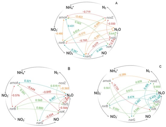 N2O is mainly generated as a product of microbial-mediated processes like denitrification or as a “by-product” of nitrification, including nitrifier denitrification, or dissimilatory nitrate reduction (NO3− to NH4+) [13,14,23,24,25,26]. These processes are catalyzed by different enzymes encoded by distinct functional genes, e.g., [14,23,24]. Among these functional genes, amoA (encoding ammonium monooxygenase), nxrB (encoding nitrite oxidoreductase), narG (encoding nitrate reductase), nirK/nirS (encoding nitrite reductase), and nosZ (encoding N2O reductase) have been most frequently investigated [13,14,27,28]. These microbial-mediated processes are influenced by various factors, e.g., soil moisture, oxygen availability, temperature, and the availability of reactive N compounds (e.g., ammonium (NH4+) and nitrate (NO3−)), as well as root exudates segregated by the cultivated crop, which in turn could influence the microbial N2O production potential [13,14,23].